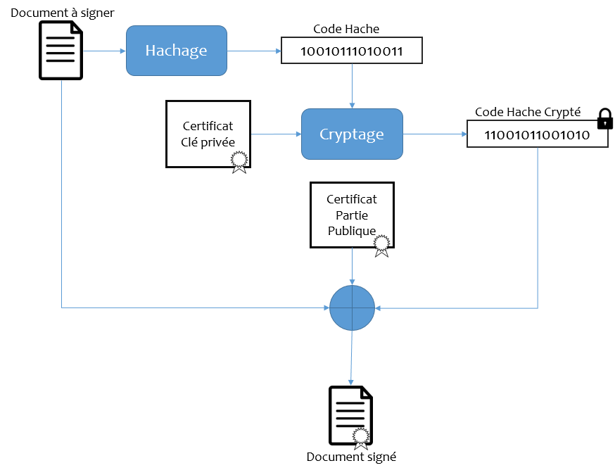 Techniquement, la signature d’un document est juste la compilation du document d’origine, la partie publique du certificat du signataire et le code hache du document crypté par la clé privée du signataire. Ainsi, la génération de signature électronique peut se faire en trois étapes :