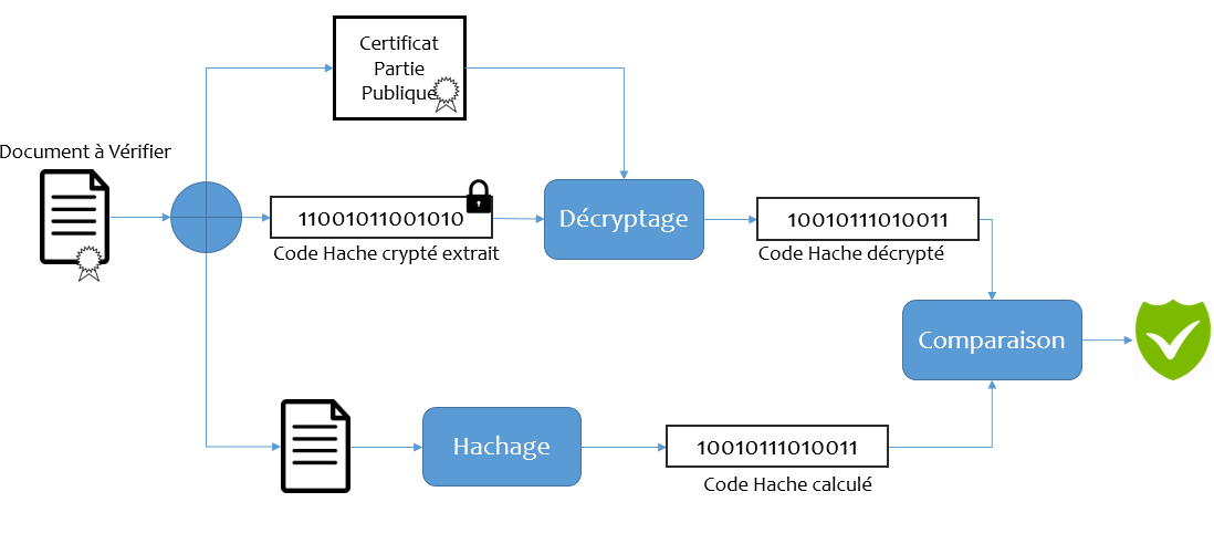 4. On compare alors le code hache calculé avec le code décrypté, s’ils sont identiques, la signature est considérée valide.