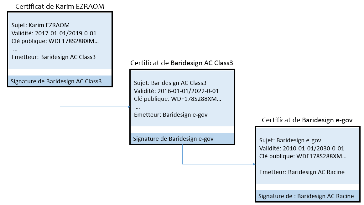La troisième option, est en pratique, au moins aussi difficile que la deuxième. En effet la crédibilité du certificat est définie par une certaine récurrence, appelée chaine de confiance ou chaine de certificat. Le contenu de chaque certificat doit être signé par l’émetteur du certificat. Comme la signature électronique contient aussi le certificat (partie publique) du signataire, on construit alors une chaine de certificats telle qu’illustrée par le schéma ci-dessous :
